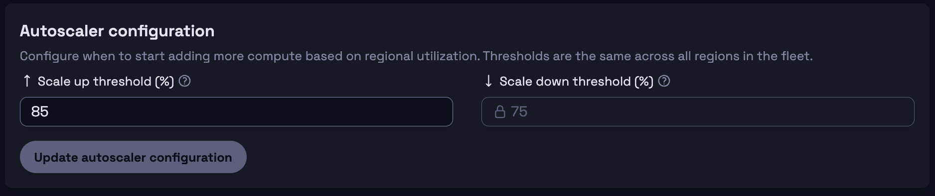 When you customize the autoscaler, the scale-down threshold is automatically set to 10% below the scale-up threshold, ensuring capacity is added and removed predictably.